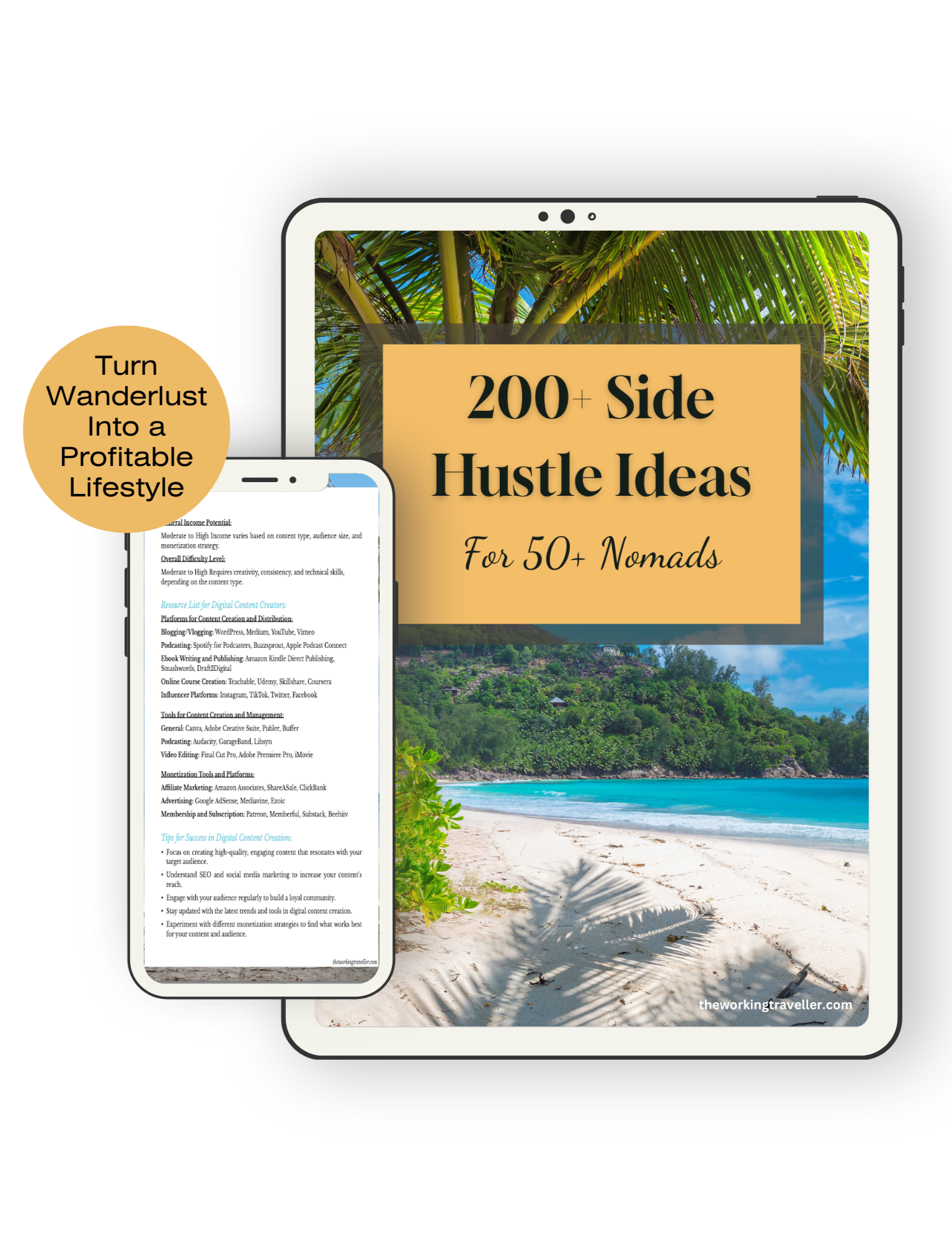 Are you 50+ and dreaming of endless travel? Unlock the secrets to funding your nomadic lifestyle! My free ebook, "200+ Side Hustle Ideas for 50+ Nomads," is your passport to financial freedom on the road. Whether you're a seasoned traveler or just starting your journey, discover how to turn your wanderlust into a sustainable, income-generating adventure.